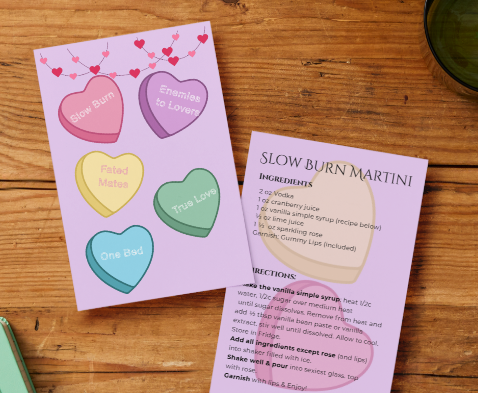 - A bookish themed drink recipe card complete with drink garnish and drink glitter.